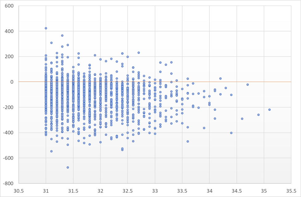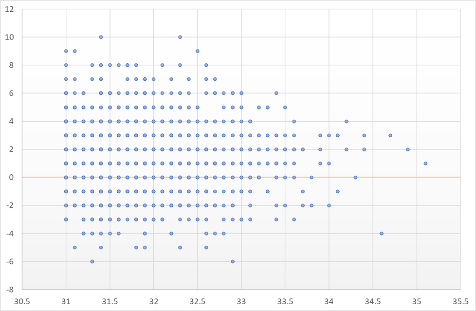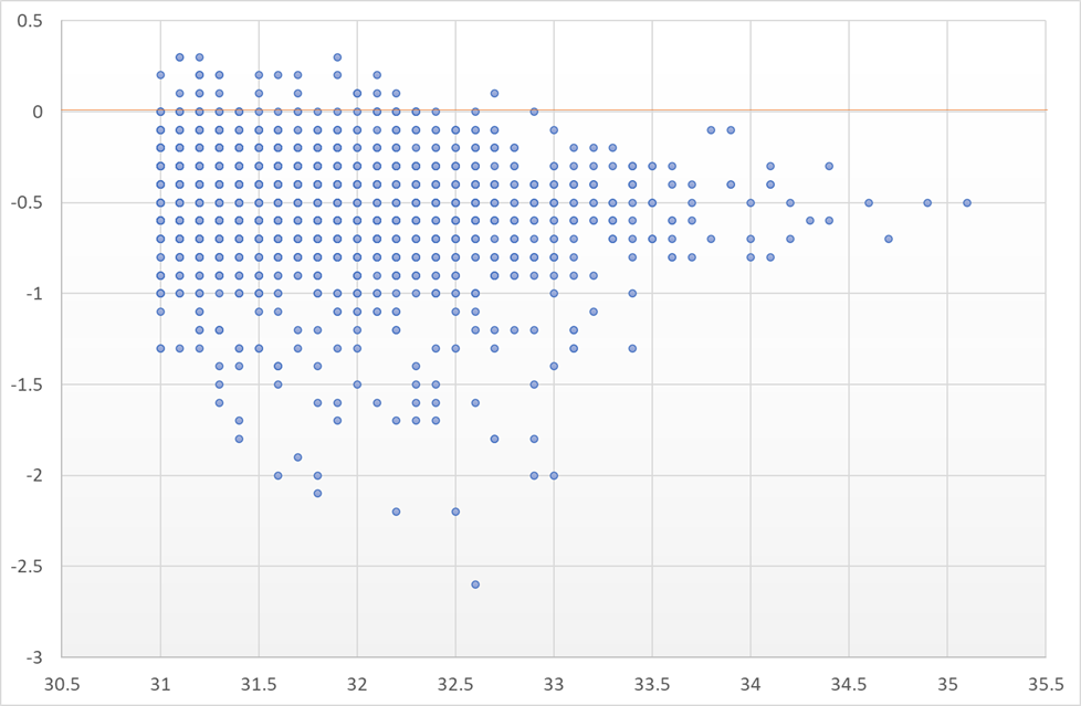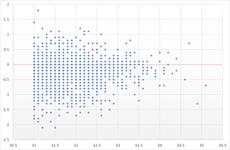 図1 1kmメッシュ暑さ指数と環境省実測値との差分(縦軸)の散布図(横軸:環境省実測値)