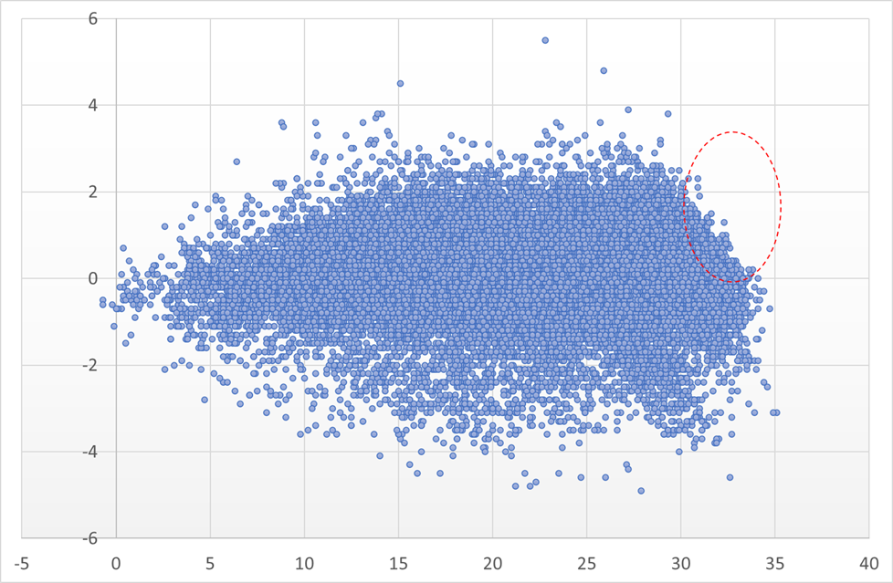 今回注目するのは、図1の赤点線で囲ったあたりの環境省実測値が30度程度以上のときに正の誤差が少なくなっている部分です。