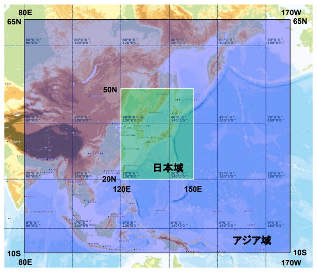 まずデータの領域ですが、日本域データの「北緯20度~50度、東経120度~150度」に対して、アジア域データは「南緯10度~北緯65度、東経80度~西経170度」になります。
