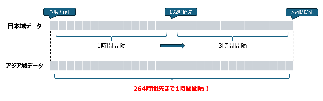 この変更により、初期時刻から最終予報時間(264時間先)まで一定間隔の地上面の予報データを利用できるようになりました。