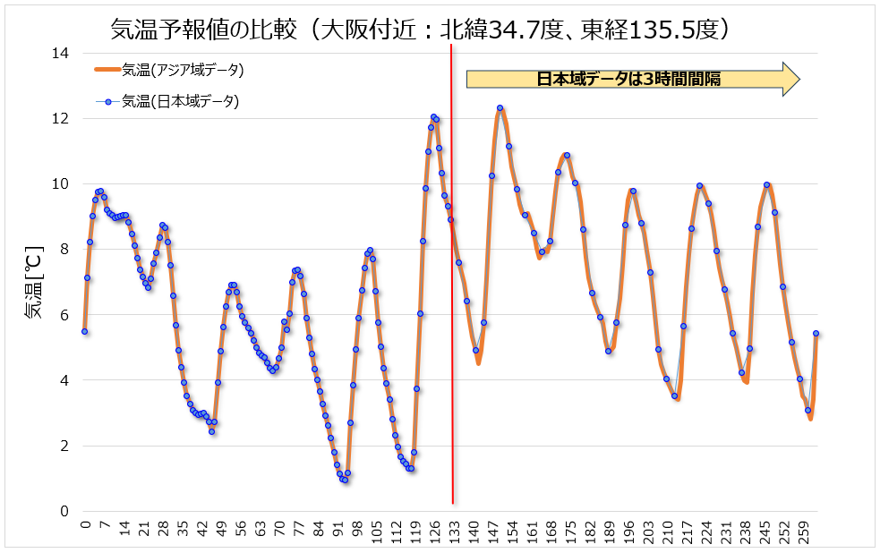 132時間より先の予報では、青い点(日本域データ;3時間間隔)よりもオレンジの線(アジア域データ;1時間間隔)の方が、細かい時間変化を表現しています。